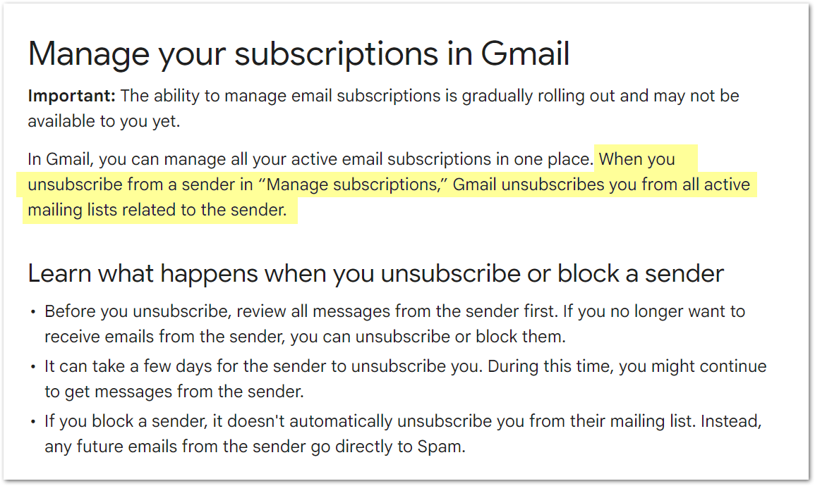 When you go to Manage Subscriptions, Gmail shows you addresses that’ve sent enough marketing email to be trusted, which it then considers a “Subscription”: