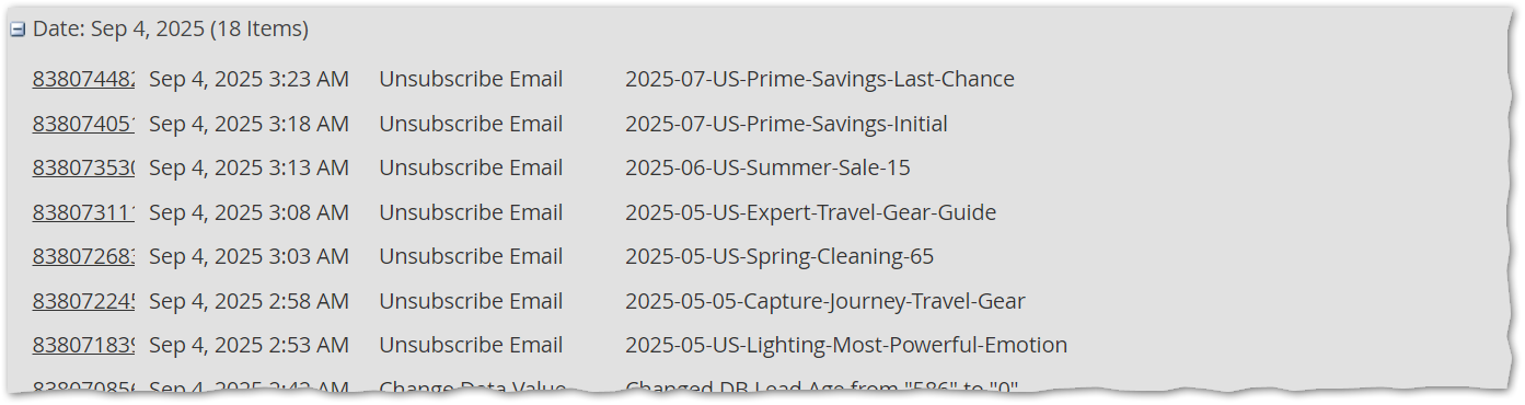 You see a series of Unsubscribe Email activities, roughly 5 minutes apart, covering more or less all the emails someone received: