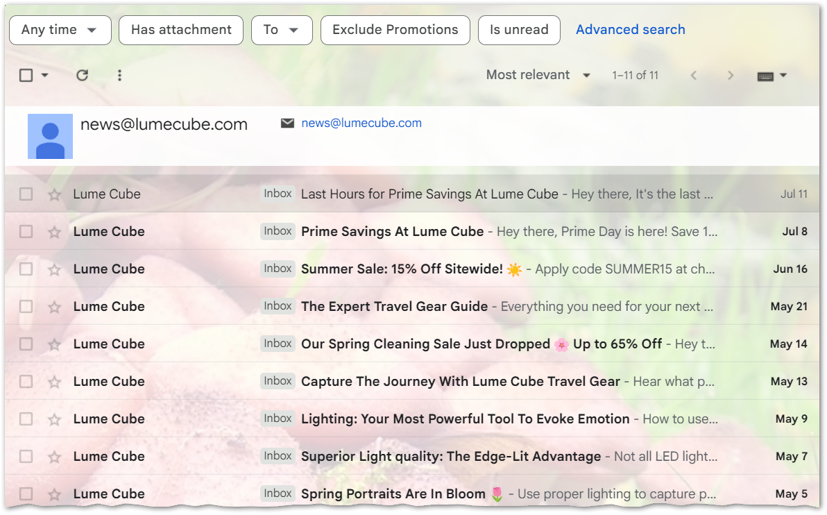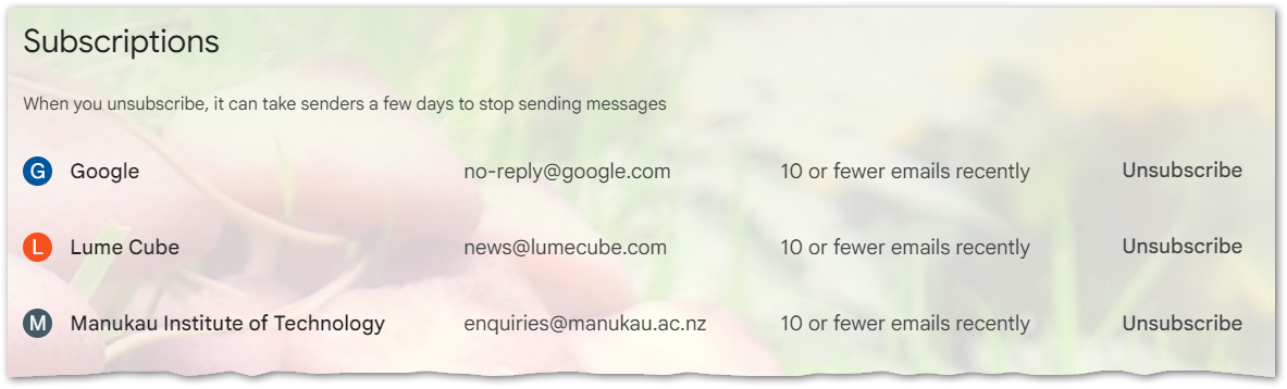 Clicking on a Subscription shows emails from that sender that are still in your mailbox: