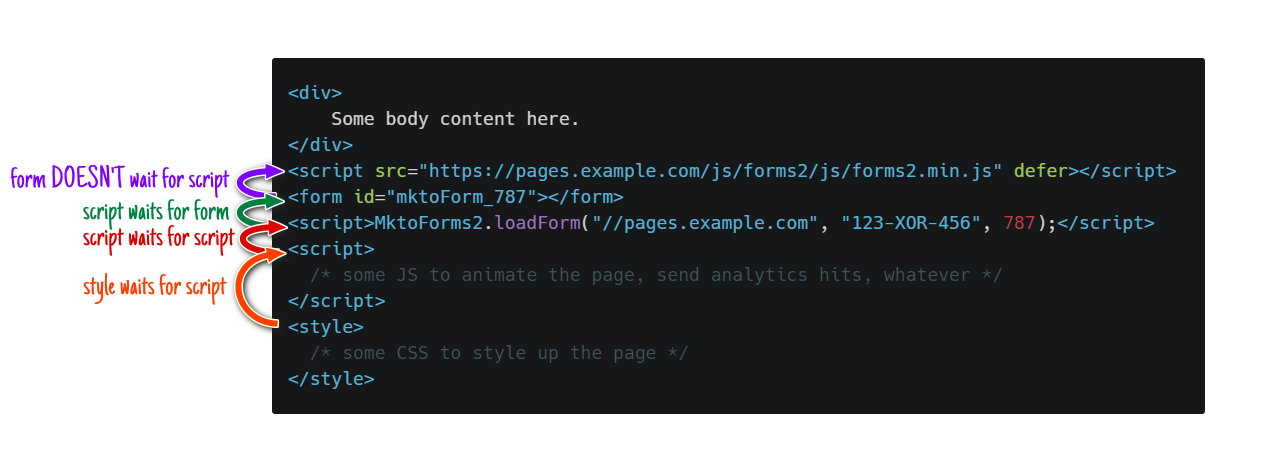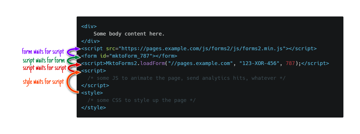 <script>MktoForms2.loadForm("//pages.example.com", "123-XOR-456", 787);</script>In the default embed code shown above, the call to MktoForms2.loadForm in the second, local <script> block is guaranteed to work, because it comes after the first, remote <script> that loads forms2.min.js. The browser ensures the first script has loaded and run before proceeding.