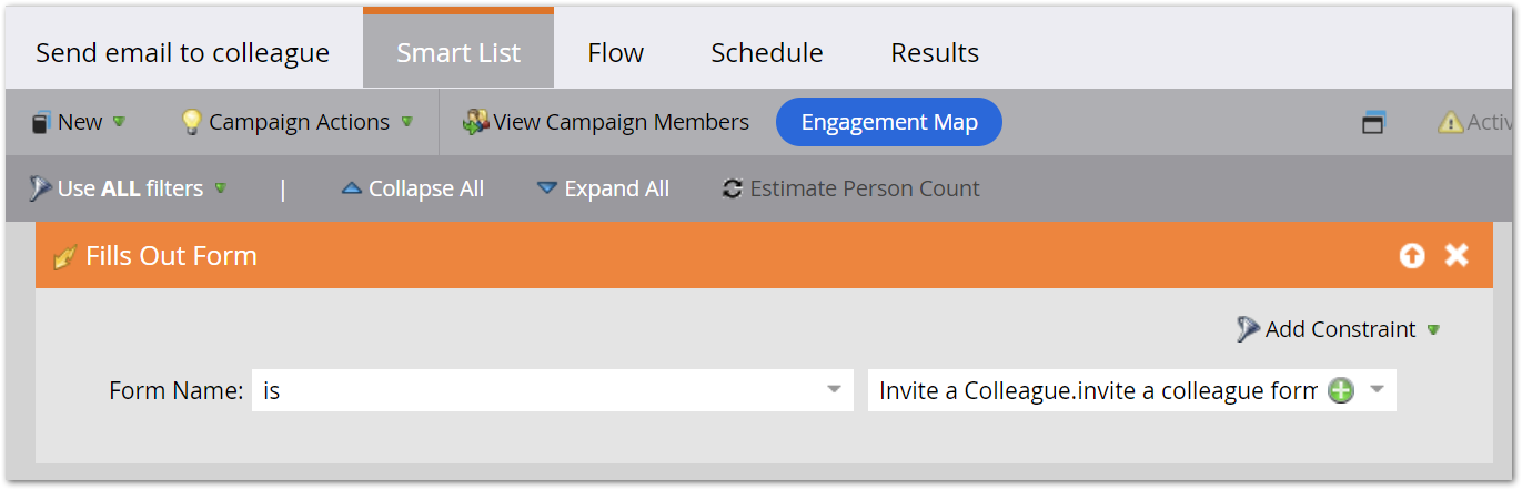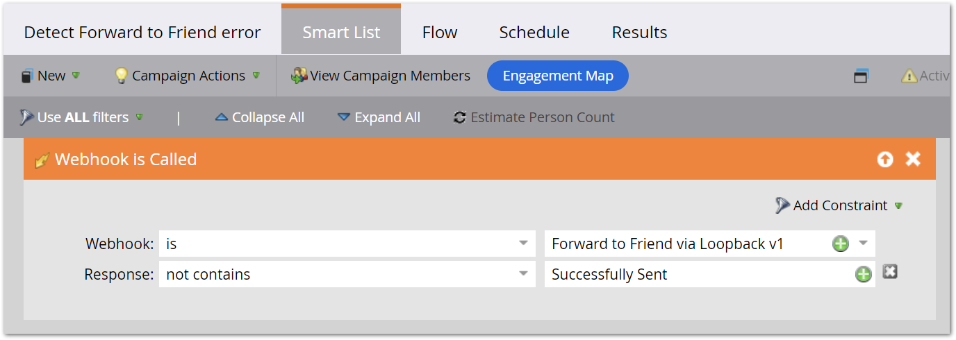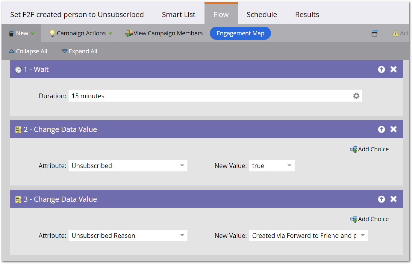 N.B. Latency between the F2F service and the core platform is unpredictable enough that I’m forced to recommend an arbitrary Wait step. I hate doing it, but we don’t have an event to trigger on. 15 minutes will work fine: if it takes longer than that for Marketo to queue the message, you’ve got far bigger problems!