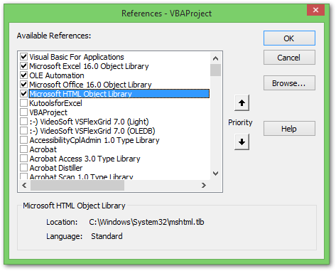So open up VBA (I do assume a basic comfort level with Excel’s VBA UI, even if you’re not a coder) and first go to Tools » References and check off Microsoft HTML Object Library: