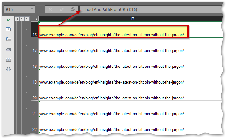 That gives you the custom function hostAndPathFromURL to use as a formula:
