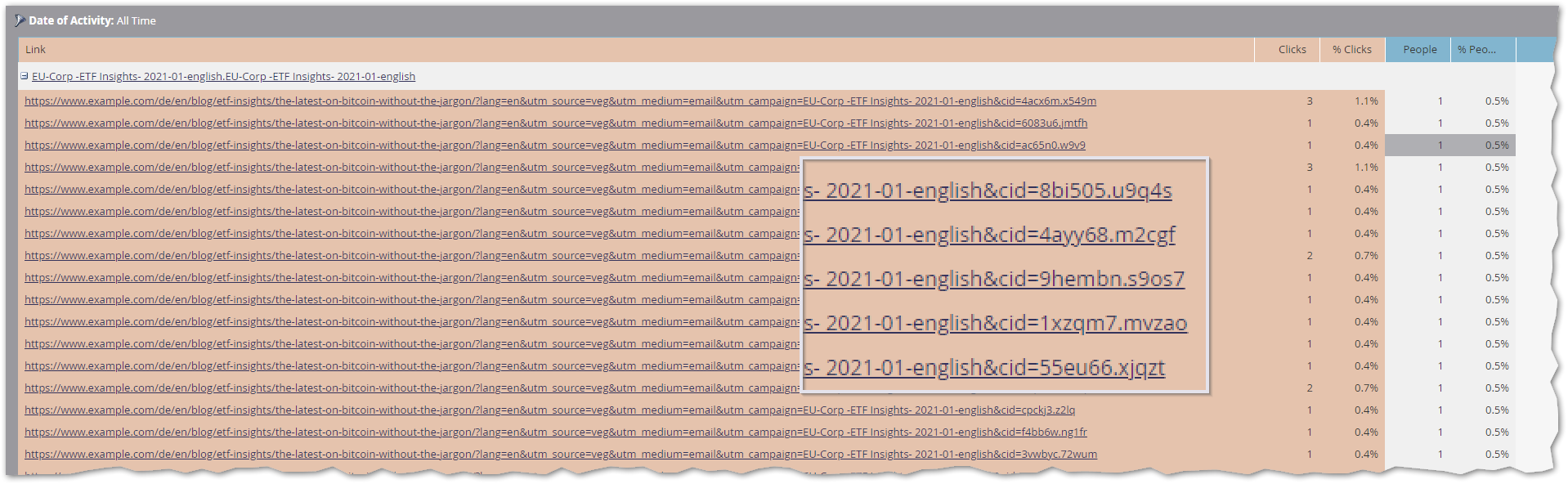 Marketo’s Email Link Performance reports are (rightfully) precise. Link URLs are considered as a whole — host, path, query string, and hash — so if you have one or more query params that’re different per lead, all your links will be broken out separately.