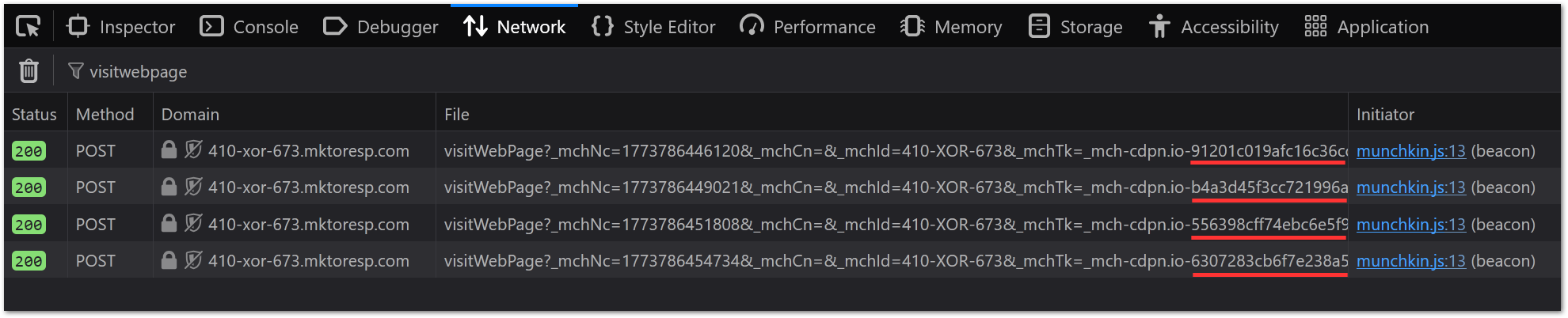 Here’s a browser log for 4 successive page refreshes with this unfortunate setup. Note how the session token value (transported to Marketo as _mchTk) changes each time:
