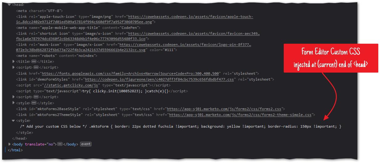 When a form descriptor is loaded from Marketo, the contents of the Custom CSS box are injected at the base of the <head>, in a dedicated inline <style>: