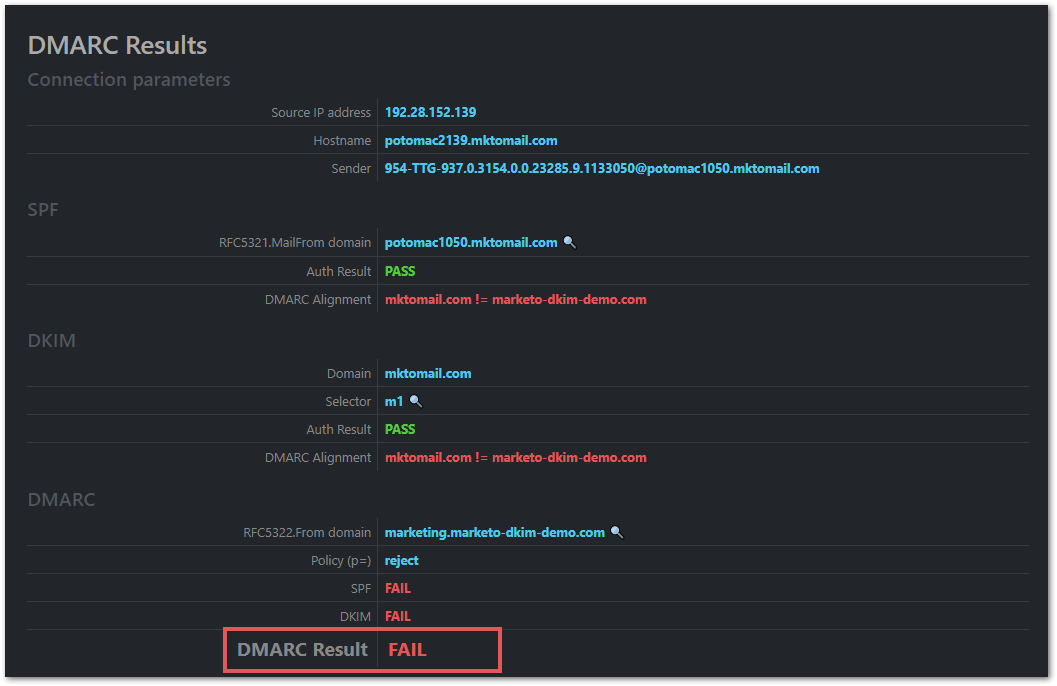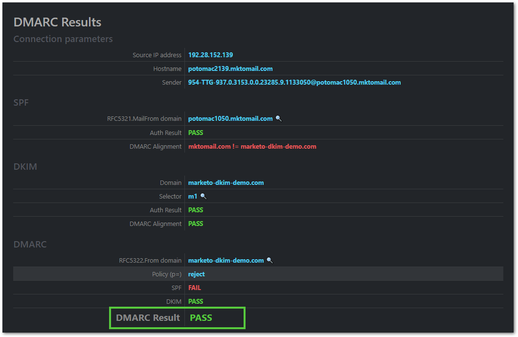 [4] Again, the SPF check will pass in general. But it won’t pass for marketo-dkim-demo.com, it’ll pass for Marketo’s internal something.mktomail.com domain. Which is fine and good, but won’t help you pass DMARC.