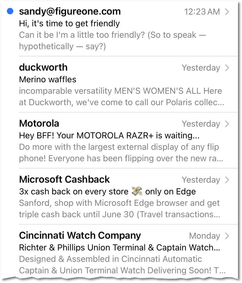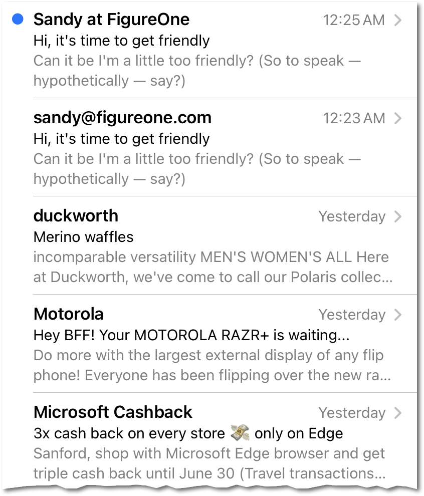 From: "Sandy @ FigureOne" <sandy@figureone.com>The app sees the display name “Sandy @ FigureOne” as a possible phishing attempt because it looks like an email address but doesn’t match the real address (“sandy@figureone.com”).
