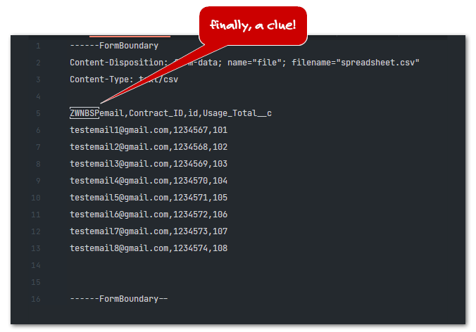 send closing MIME data (--boundary--)They knew the .csv file on disk was already encoded as UTF-8, same encoding they wanted to send to Marketo. So rather than wastefully reading the file into memory and decoding it, only to reencode it into the same sequence of bytes, they just streamed the file as-is to the API.
