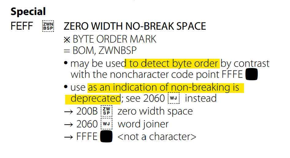 To understand how it gets in there, and why you’ll see it again if you don’t do something, you need to think of its other identity: not ZWNBSP but BOM, Byte Order Mark. In fact, in the Unicode spec you aren’t supposed to use it for no-breaky-ness anymore, but you can still use it for byte order: