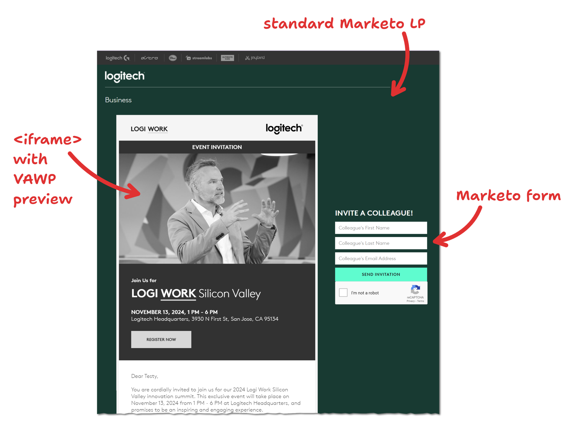 You might think you could just set the <iframe src> to the VAWP URL (https://landingpages.example.com/index.php/email/emailWebview) with the main document’s mkt_tok copied into its query string, e.g.: