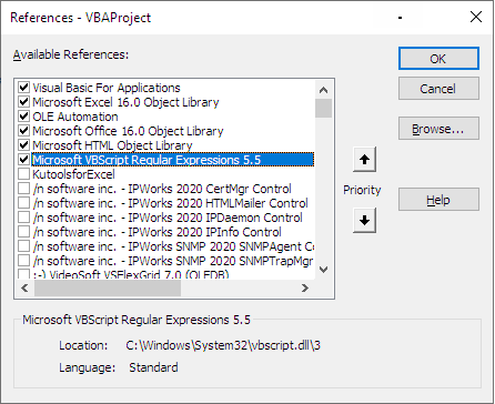 In Tools ยป References, check off two non-default references: Microsoft HTML Object Library and Microsoft VBScript Regular Expressions 5.5: