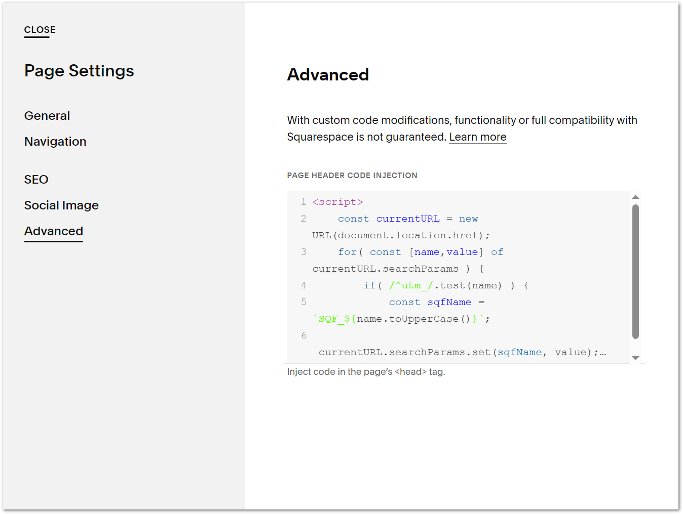Ideally, you’d pop the Marketo form embed code in a Squarespace code block instead of using Squarespace forms, sidestepping this issue. But maybe someone at your company likes the way Squarespace forms look and/or has an exaggerated belief in the Squarespace ⮕ Marketo integration. If that’s the case, then open Page Settings » Advanced: