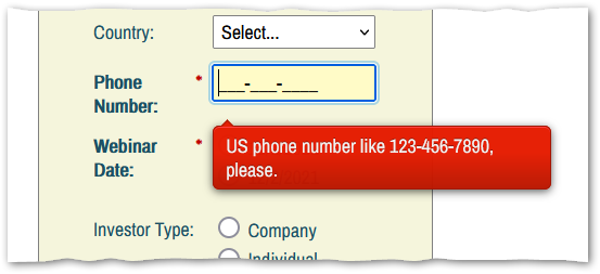 * There’s no browser that can natively do what the input mask does, so it’s not a “polyfill” for anything. Yes, you can do regexp pattern matching with <input pattern="\d{3}-\d{3}-\d{4}"> but that won’t do the underscore-cursor-placeholder stuff.