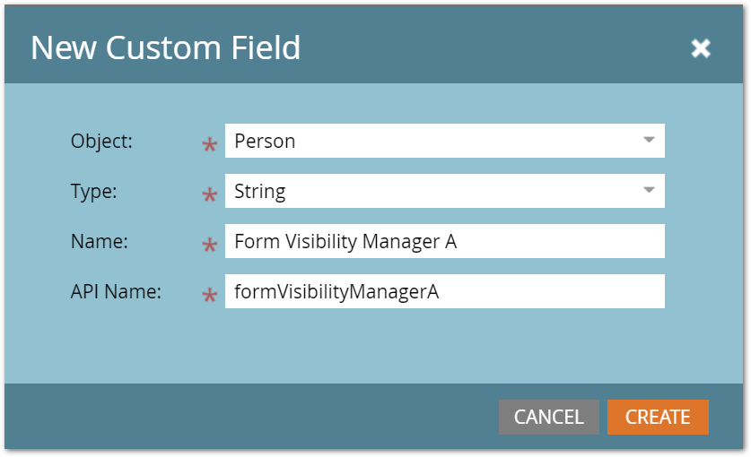 Create a new field as shown below. With my clients, I refer to such fields by their “pseudotype”: they’re form visibility manager fields[1] and we create one or two in every instance. In the Marketo database, its datatype is simply string, but to convey its special use we use the pseudotype.