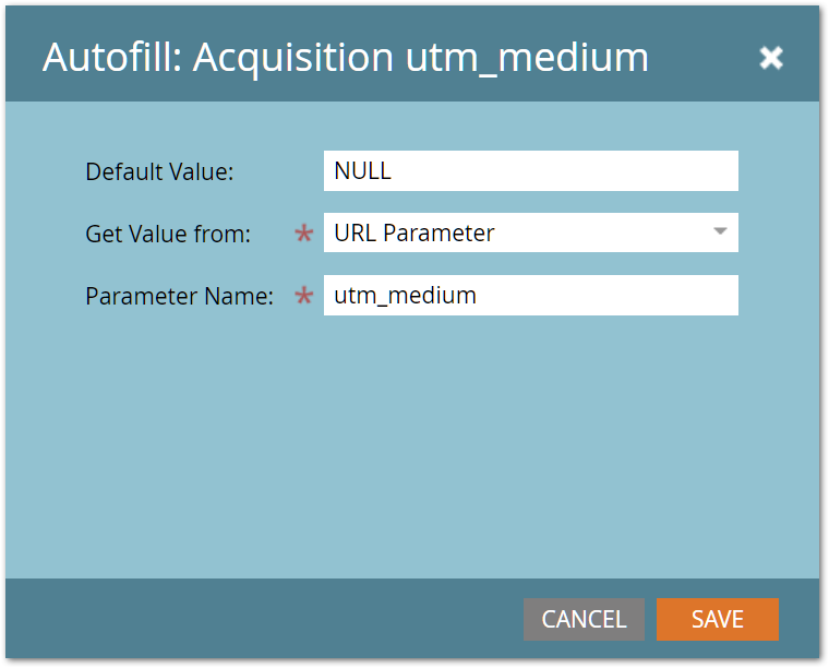 This last example is a hidden field that's set to Autofill from the query param utm_medium, falling back to the string “NULL” if the param is missing or empty: