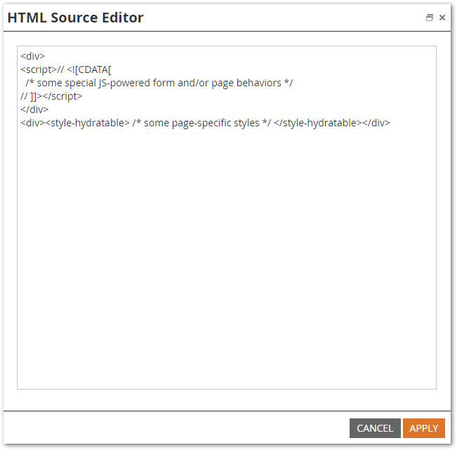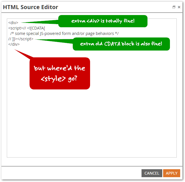 The <script> element, in contrast, is supported. (Yes, it’s wrapped in old-school commented-CDATA but it works just fine.) Plus there’s a wrapper <div> added by default.[1]
