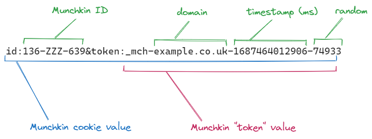 The token contains everything else: the domain corresponding to the Munchkin domainLevel option, the millisecond timestamp of when the cookie was first set, and a random integer to increase uniqueness.