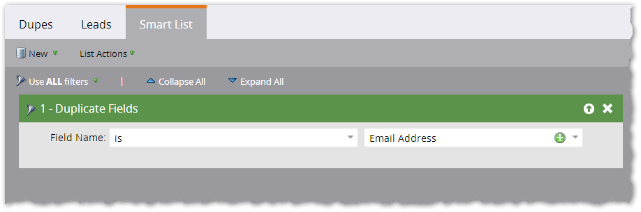 First, the Smart List, which simply uses the Duplicate Fields filter: