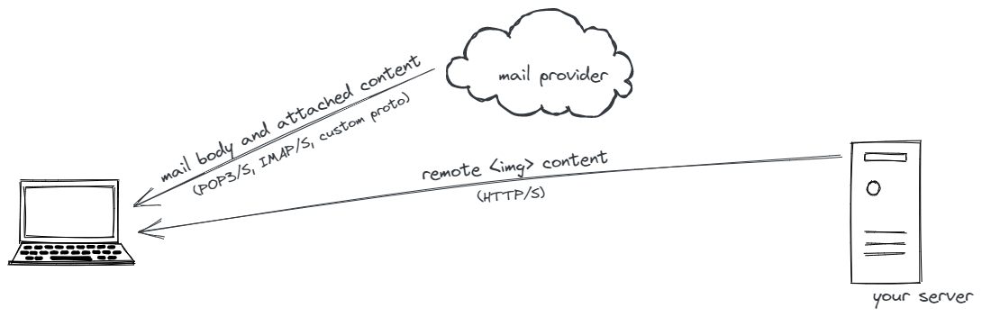 That second example is something an attacker can potentially do against a desktop email client. Even if an email’s HTML structure is fetched securely — say over IMAPS — when the client renders the email, it fetches remote images directly from your server. If a hacker is eavesdropping on your local network (which could happen anywhere other than your home or office) they could swap out the image for another one:
