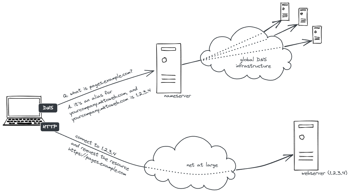 So when you open https://pages.example.com, first thing it does is ask its configured DNS servers for the IP address of pages.example.com. It gets a DNS response like this: