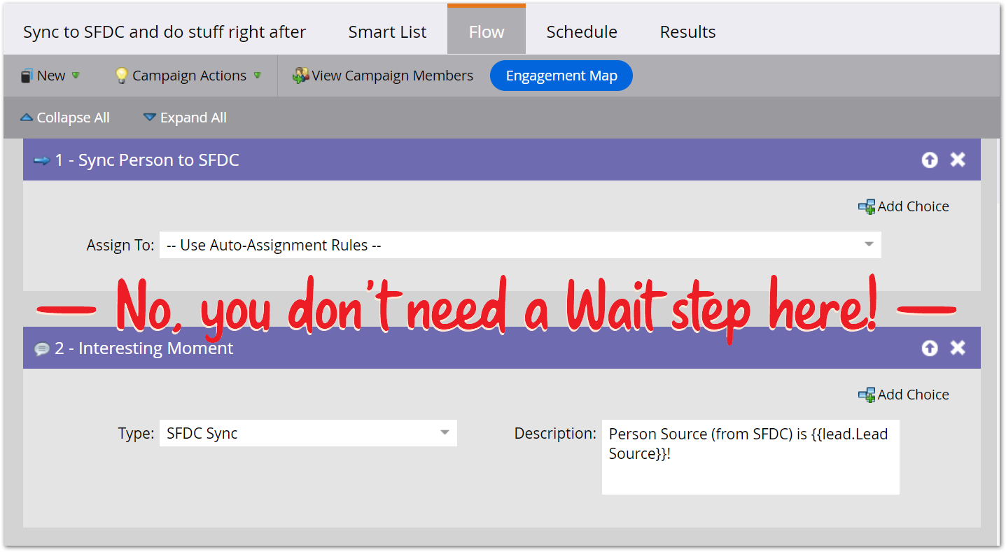 Let’s run a real-world test. The flow runs Sync Person to SFDC and immediately logs an Interesting Moment — no Wait — and crucially, the IM description includes Lead Source, a field that’s only populated when Marketo gets the value from SFDC: