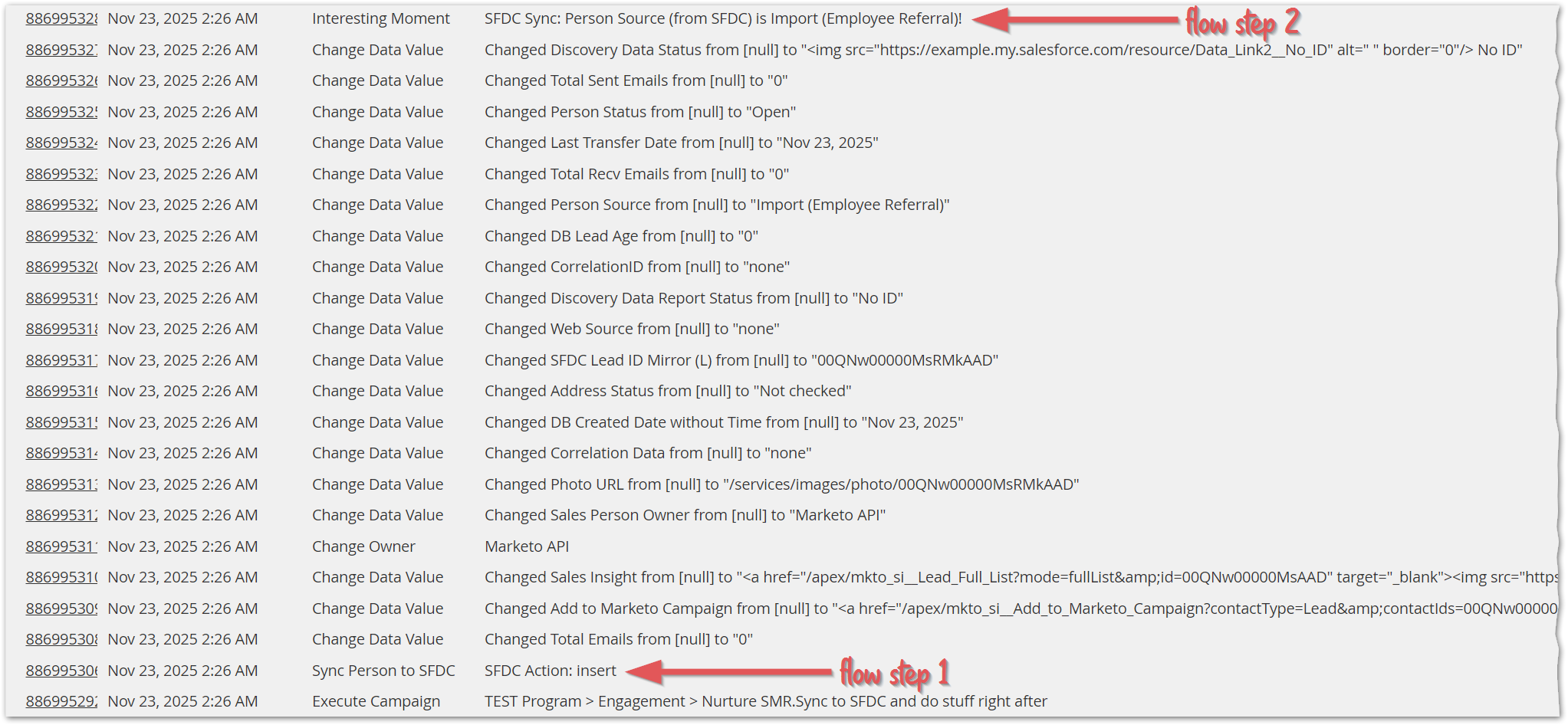 As you can see, Sync Person runs and is followed by a host of other data value changes fetched from SFDC. After all those updates comes the Interesting Moment, with Lead Source “Import (Employee Referral)” populated in the IM as desired.