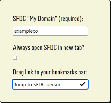 Just go to the SFDC Bookmarklet Maker and enter your SFDC “My Domain” in the top field: