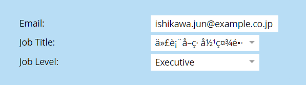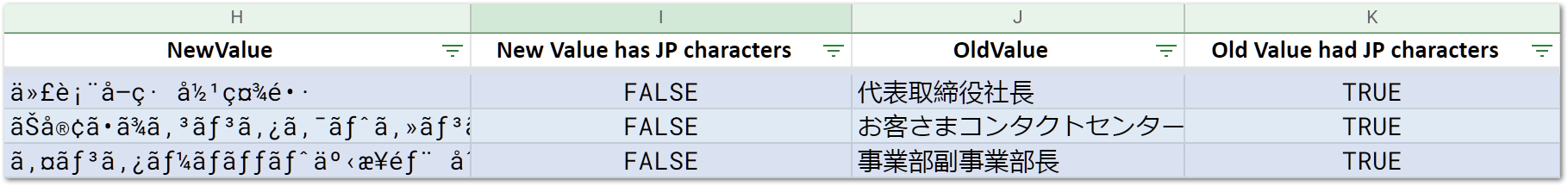 The new value, of course, is gibberish. A specific type of gibberish, to be sure — UTF-8 mistakenly decoded as ISO-8859-1 and then encoded to UTF-16, we think — but it can’t be repaired in place. (What happened here: nobody noticed list imports done on behalf of the Japanese satellite office — but not by people in that office, who understand the language — were persistently using broken encoding.)