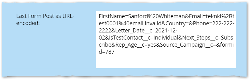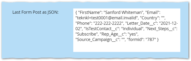 To solve those problems, the code below lets you save all the fields in a form post to a single Textarea field, in JSON or URL-encoded format (or both formats at the same time). Here’s what the result looks like in the UI: