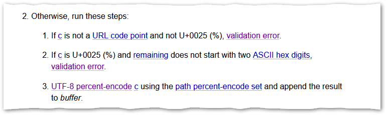 So in those cases, the character will be left exactly as-is. If you want the non-special meaning, you must encode it yourself. Better yet: correctly encode all invalid characters and don’t rely on the browser to rescue you. But at the same time, know that browsers offer some cushion and don’t freak out if you forget %20 on occasion.