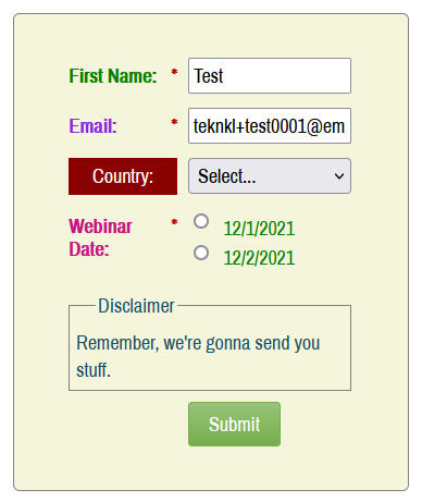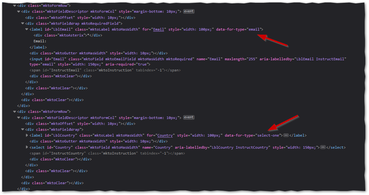 <label id="LblProductInterest" for="ProductInterest" class="mktoLabel for-type-radio"><label id="LblIndustry" for="Industry" class="mktoLabel for-type-select-one">You can then use generic CSS selectors, i.e. .mktoForm label.for-type-radio. After all, you almost certainly want to style all labels for radio buttons the same way (on a given form). You don’t need to know the field name for that!