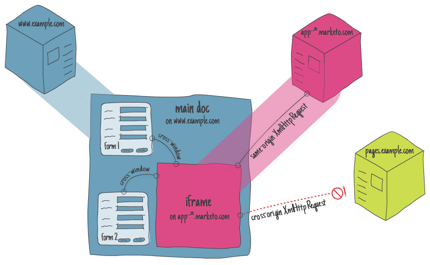 “How could the embed not use a cross-origin post? If my website is https://www.example.com and my Marketo instance is https://app-sj01.marketo.com, that’s cross-origin! And same with https://pages.example.com, because the origin includes the hostname.”