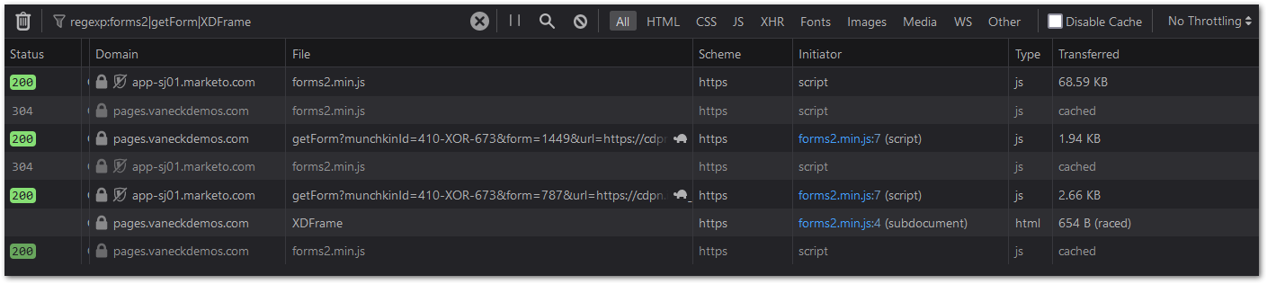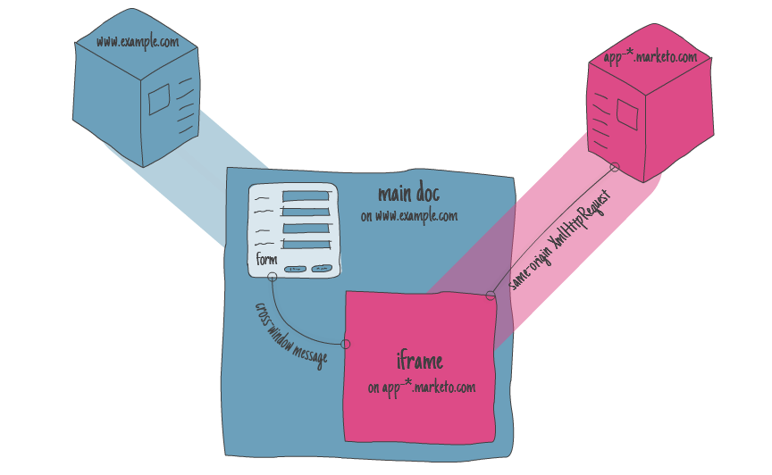 loadForm(). That IFRAME hosts a tiny HTML page that loads another copy of the library. - When the form is ready to submit, the library (the one loaded by the main document) uses JS postMessage to pass form field values over to the IFRAME. It also includes the final Marketo endpoint URL where the IFRAME is expected to post the data.