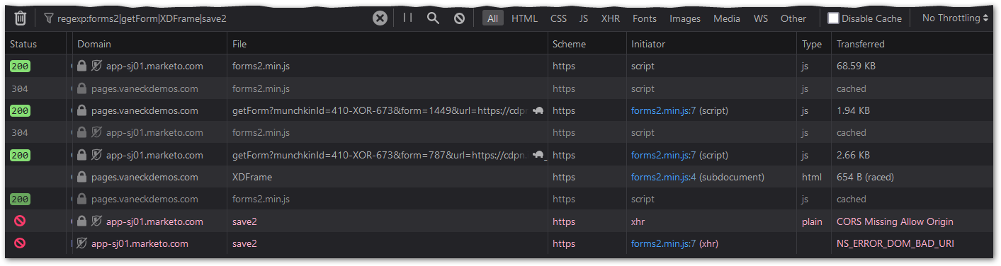 So this is smart programming, but it has a side effect. Only one same-domain IFRAME will ever be created. And that IFRAME will originate from the first domain passed to loadForm. Subsequent forms will merrily pass messages to that same IFRAME, expecting it to be able to post to the back-end Marketo instance.