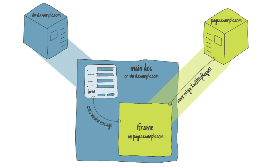 But that won’t work if the first form came from Origin A (meaning the IFRAME is on Origin A) and then another form says, “Hey IFRAME, pass this data to Origin B, okay?” That’s a cross-origin attempt and will fail: