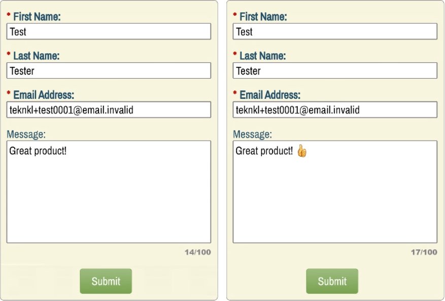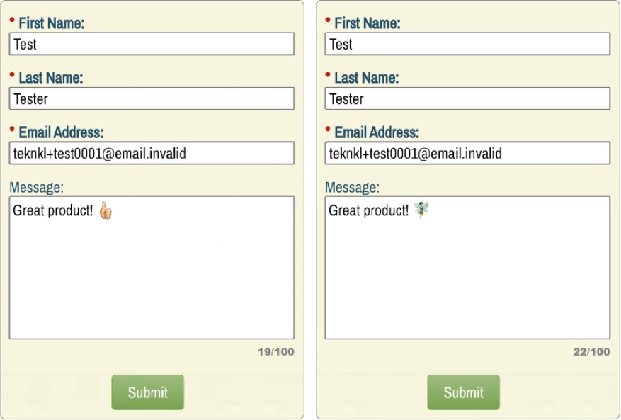 But for real apps, you’d likely want a string like “😄😄😄😄😄😄😄😄😄😄” to have the same effective length as “ABCDEFGHIJ”. In that case you should use custom code that counts code points, rather than maxlength.