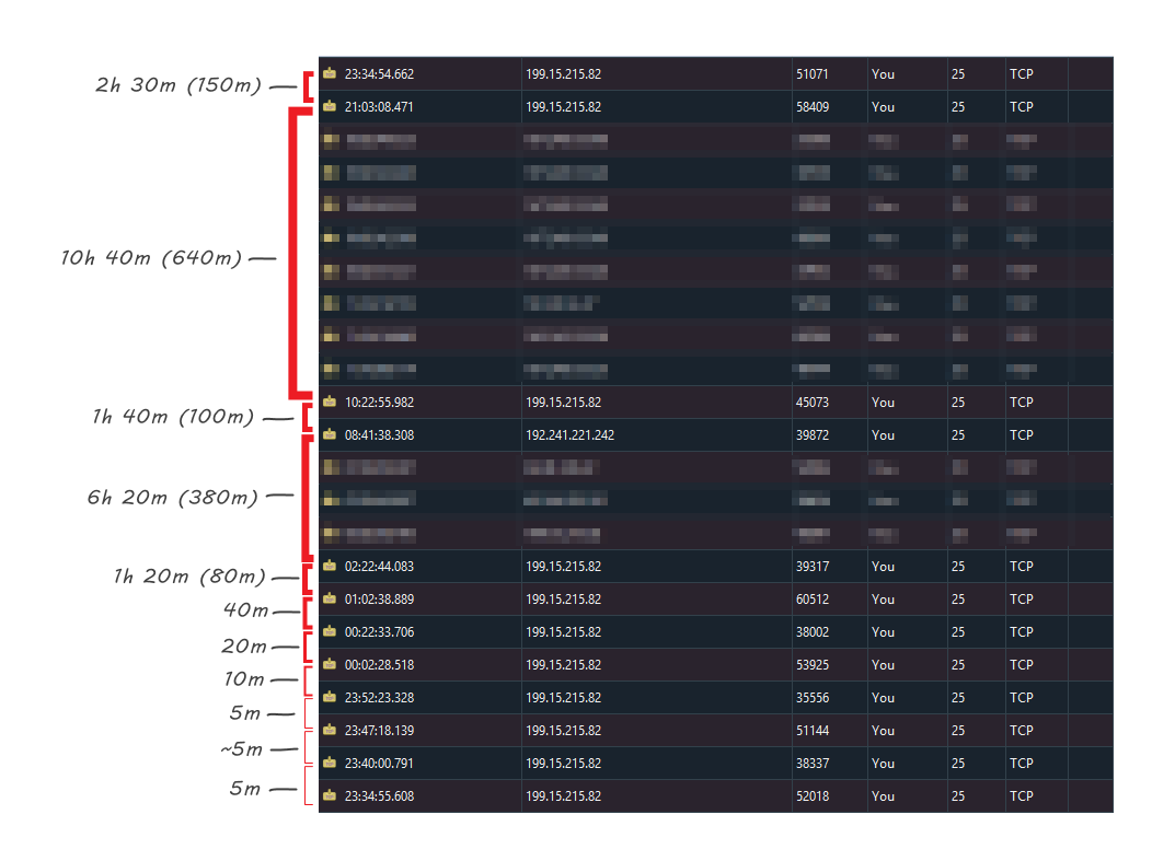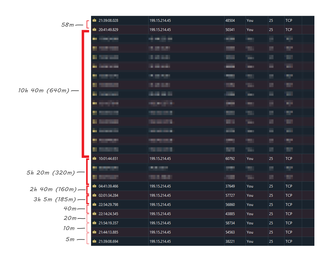 To observe Marketo’s backoff algorithm, I set up a dummy SMTP server that drops every connection before any data is sent and watched the logs. (It doesn’t reject the message itself, because you don’t want an immediate Hard Bounce. It just says “Yes, I’m here, but go away for now.”)