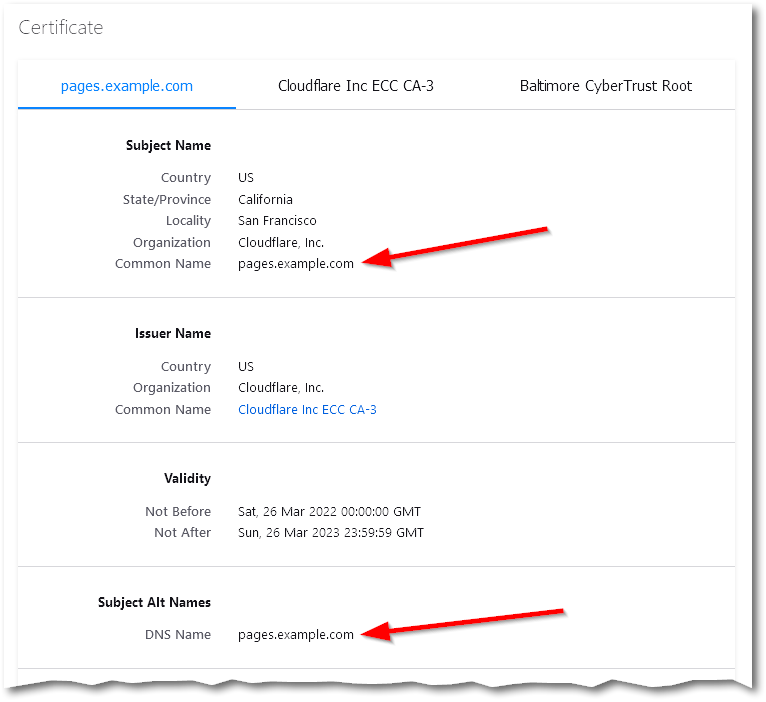 Yet Marketo LP domains don’t meet the above requirements. Marketo does use CNAMEs. But as you probably know by now, Marketo uses Cloudflare for DDoS protection and caching. Cloudflare automatically generates SSL certs that bind to a single domain, i.e. the domain you’re connecting to: